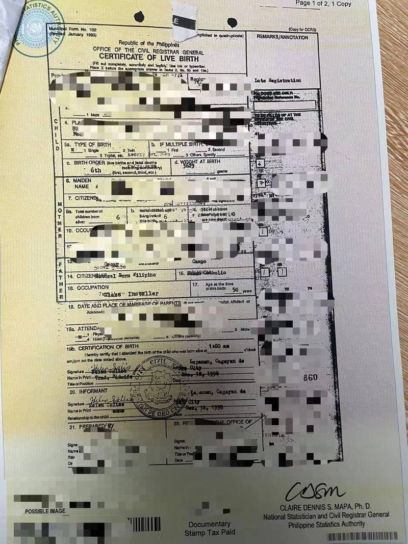 5如果一方菲藉需要提供她出生纸pSA/nso副本。